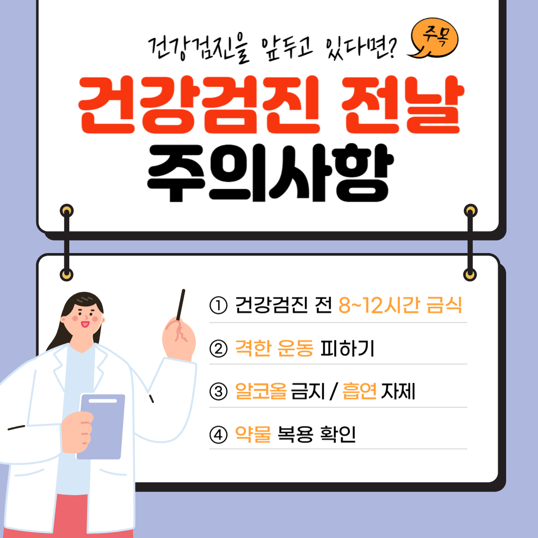 참고: 이 글은 일반적인 건강검진 준비를 위한 정보입니다. 특정 검진 항목이나 개인의 건강 상태에 따라 추가적인 주의사항이 있을 수 있으니, 반드시 병원의 안내를 따르세요.