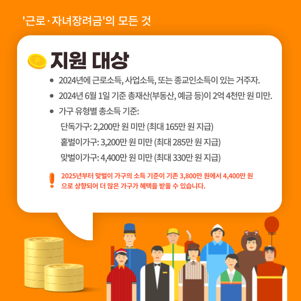 • 근로장려금: 최대 165만 원(단독) ~ 330만 원(맞벌이).