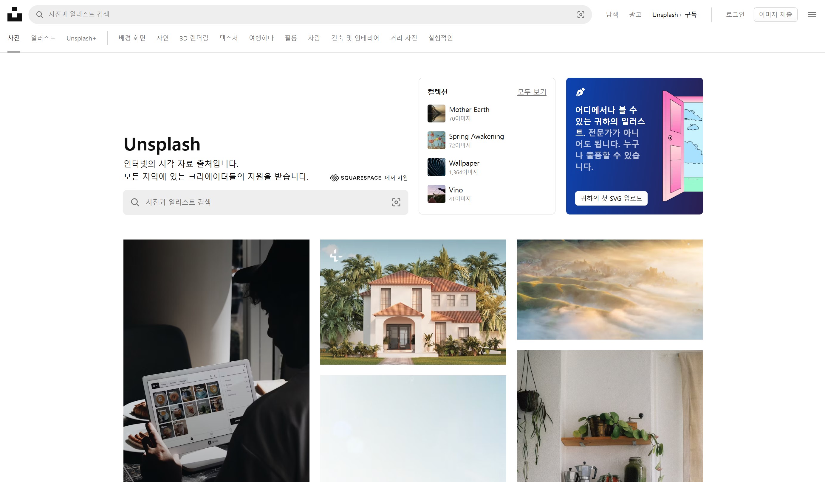특징: 고해상도 사진이 풍부하며, 커뮤니티 기반으로 매일 새로운 이미지가 업로드됨. 상업적 이용 가능, 출처 표기 불필요. API 지원으로 개발자 친화적. 에디터 추천 컬렉션으로 트렌디한 이미지 탐색 가능.