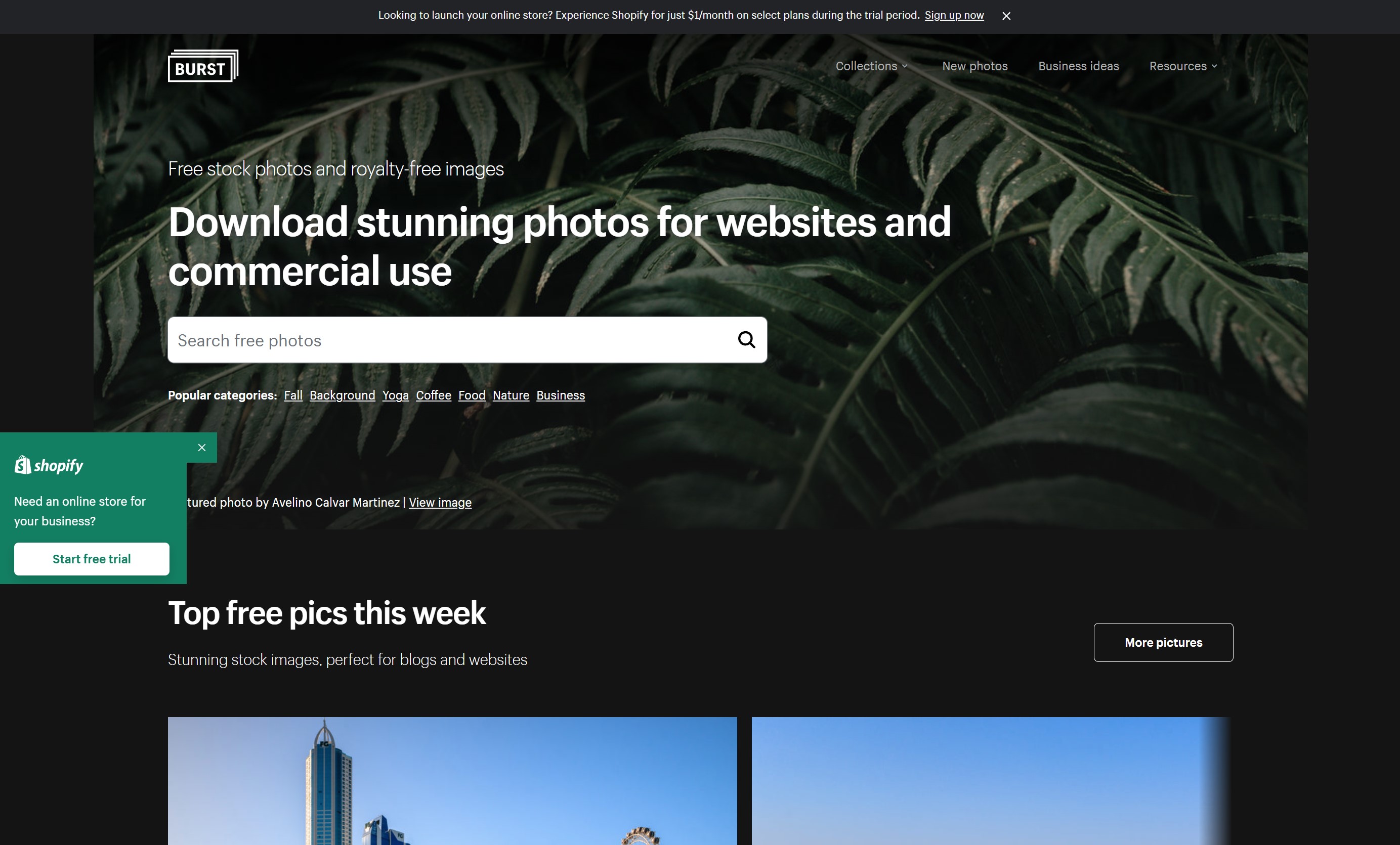 추천 이유: 제품 사진, 사무실 배경 등 비즈니스 관련 이미지가 풍부. Shopify에서 운영해 신뢰도가 높습니다.