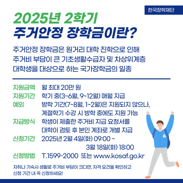 궁금한 점이 있다면 한국장학재단 홈페이지(www.kosaf.go.kr) 또는 전화 상담(1599-2000)을 통해 자세한 도움을 받을 수 있습니다. 여러분의 학업과 안정적인 주거 생활을 응원합니다! 💪